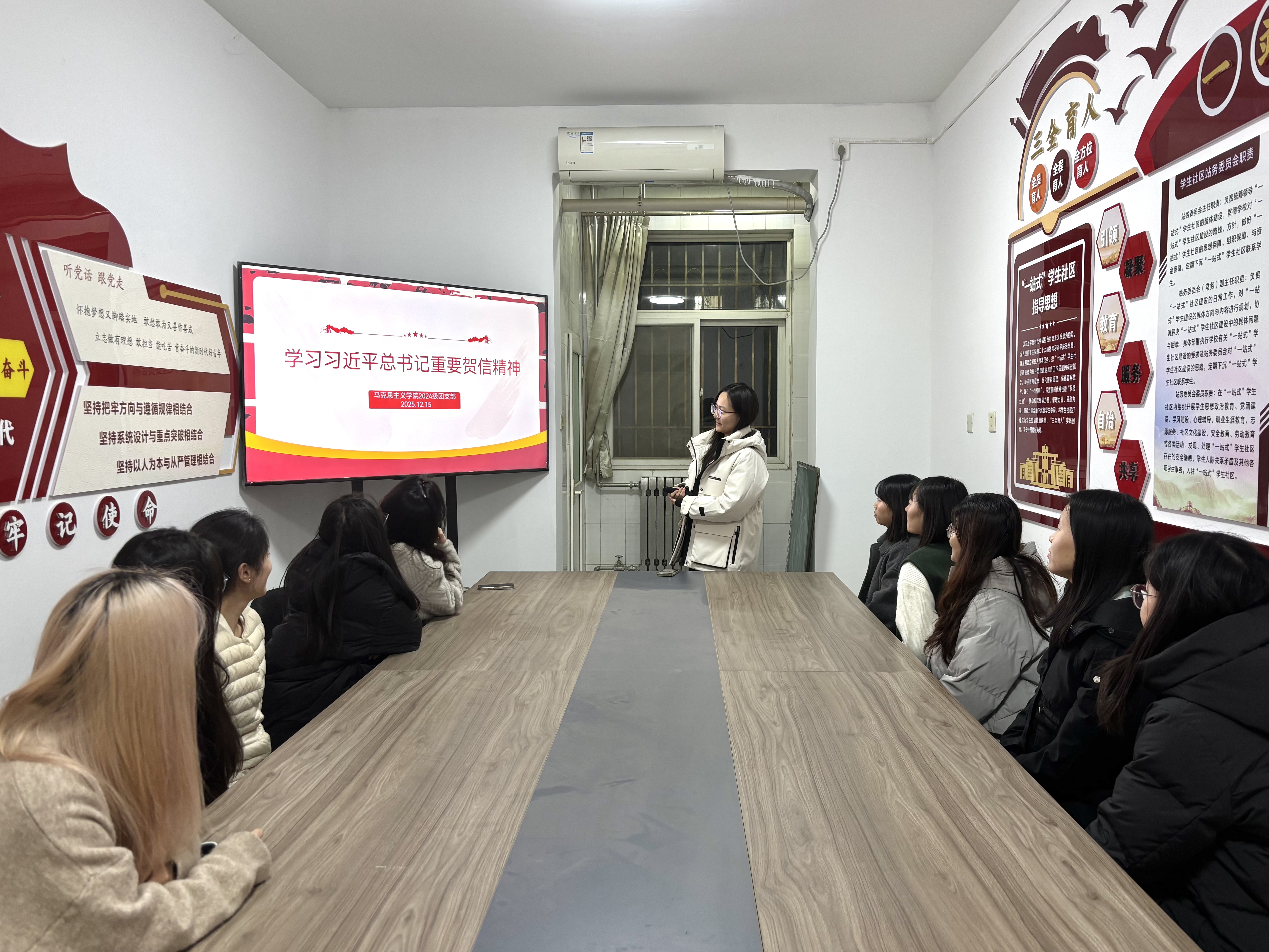 为进一步引导广大团员青年坚定理想信念、勇担时代使命,12月15日晚,9728太阳集团2024级团支部于11号公寓“一站式”学生社区开展“学习习近平总书记重要贺信精神”主题团日活动。活动由2024级团支书张睿怡主持,全体共青团员参与。