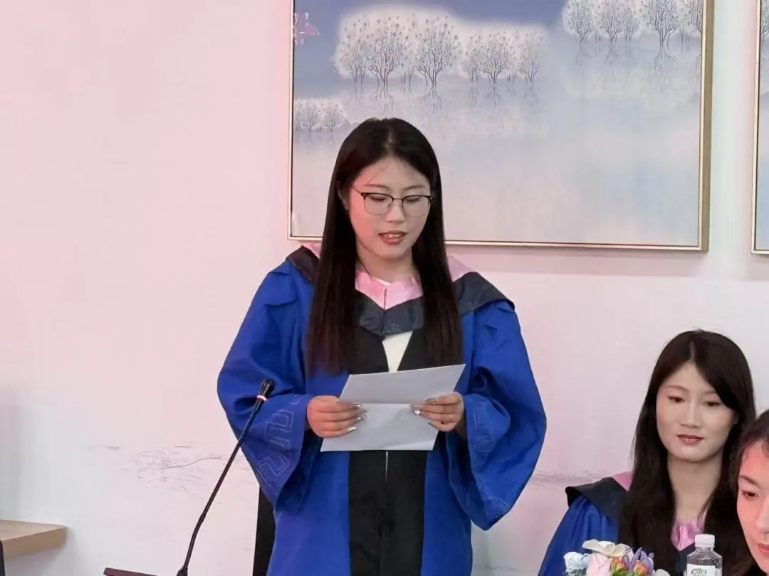 2025届毕业生闫玉洁作为学生代表发言,深情回顾研究生阶段的奋斗点滴,言语间表达着对母校及恩师的感激之情,并勉励学弟学妹们坚守理想信念,做到知行合一。