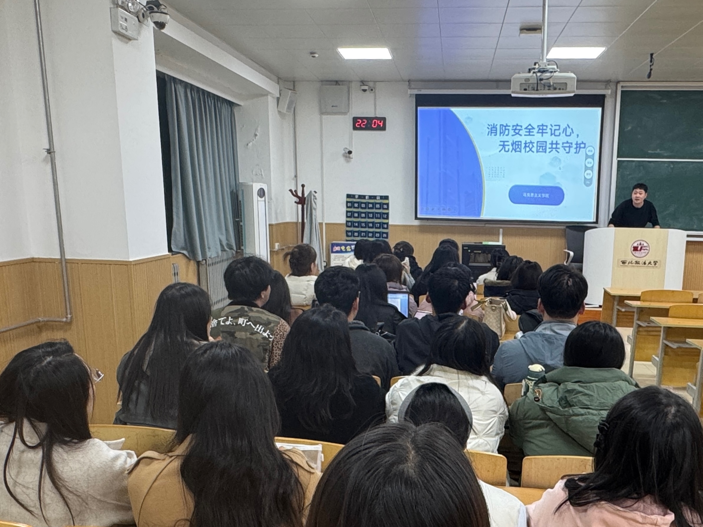 班会由2024级研究生余富茜、2025级研究生范福星同学共同组织。两位同学结合校园实际,从消防知识、防火措施、隐患排查及应急处理等方面进行讲解,提醒同学们要规范使用电器,坚决杜绝宿舍吸烟等违规行为。同时,他们号召大家以身作则,共同推动无烟校园建设,营造安全、健康、文明的学习生活环境。