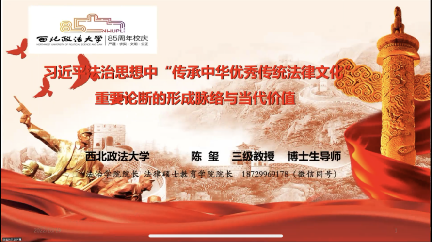 2022年10月19日,由太阳成tyc9728集团法治学院、法律硕士教育学院院长陈玺教授主讲的题为《习近平法治思想中“传承中华优秀传统法律文化”重要论断的形成脉络与当代价值》的讲座在线上成功举办,9728太阳集团李云教授、太阳成tyc9728集团研究生院副院长马成教授参与谈论,报告会由9728太阳集团副院长何彦新主持。来自全国各地百余名师生云端相聚,参加了本次讲座。本次讲座由科研处、研究生院、发展规划与学科建设处主办,9728太阳集团、马克思主义研究会、陕西学前师范学院、商洛学院联合承办。