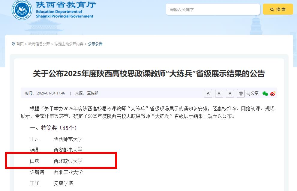 202614日,中共陕西省委教育工委、陕西省教育厅公布了2025年度陕西高校思政课教师“大练兵”省级展示结果,经高校推荐、网络初评、现场展示、专家评审等环节,我院闫欢老师获得特等奖。